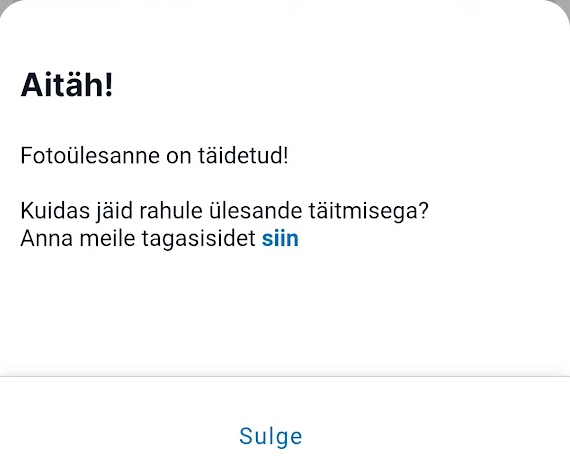 Pärast fotoülesande täitmist kuvatakse kliendile teade, et toiming õnnestus ning lisaküsimus „Kuidas jäid rahule ülesande täitmisega? Anna meile tagasisidet siin“. Lingil klõpsamise järel suunatakse kasutaja edasi Recommy keskkonda, kus saab anda hinnangu 5-palli skaalal ning vastata kahele avatud vastusega küsimusele. Skaalal valitud hinnangut saab soovi korral kommenteerida. Samuti uuritakse avatud vastusega küsimuses, milliseid kasutusvõimalusi võiks Iva äpp veel pakkuda. Kogutud tagasisidet kasutab PRIA äpi kasutusmugavuse ja funktsioonide täiustamiseks.