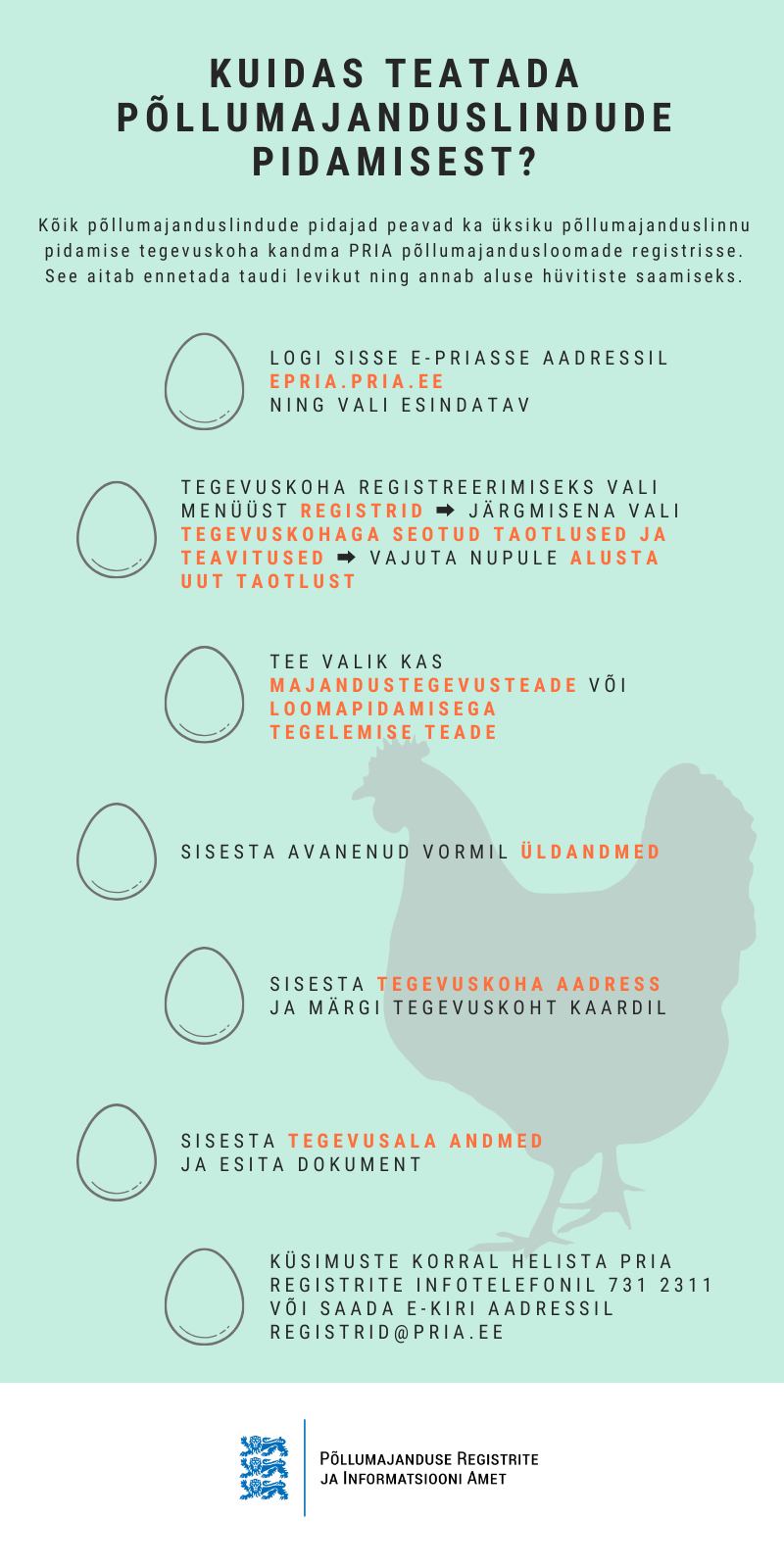 Kodulindude tegevuskoht tuleb registreerida sõltumata nende arvust. Tegevuskoha põllumajandusloomade registrisse kandmise kohta leiab lisainfot siit.