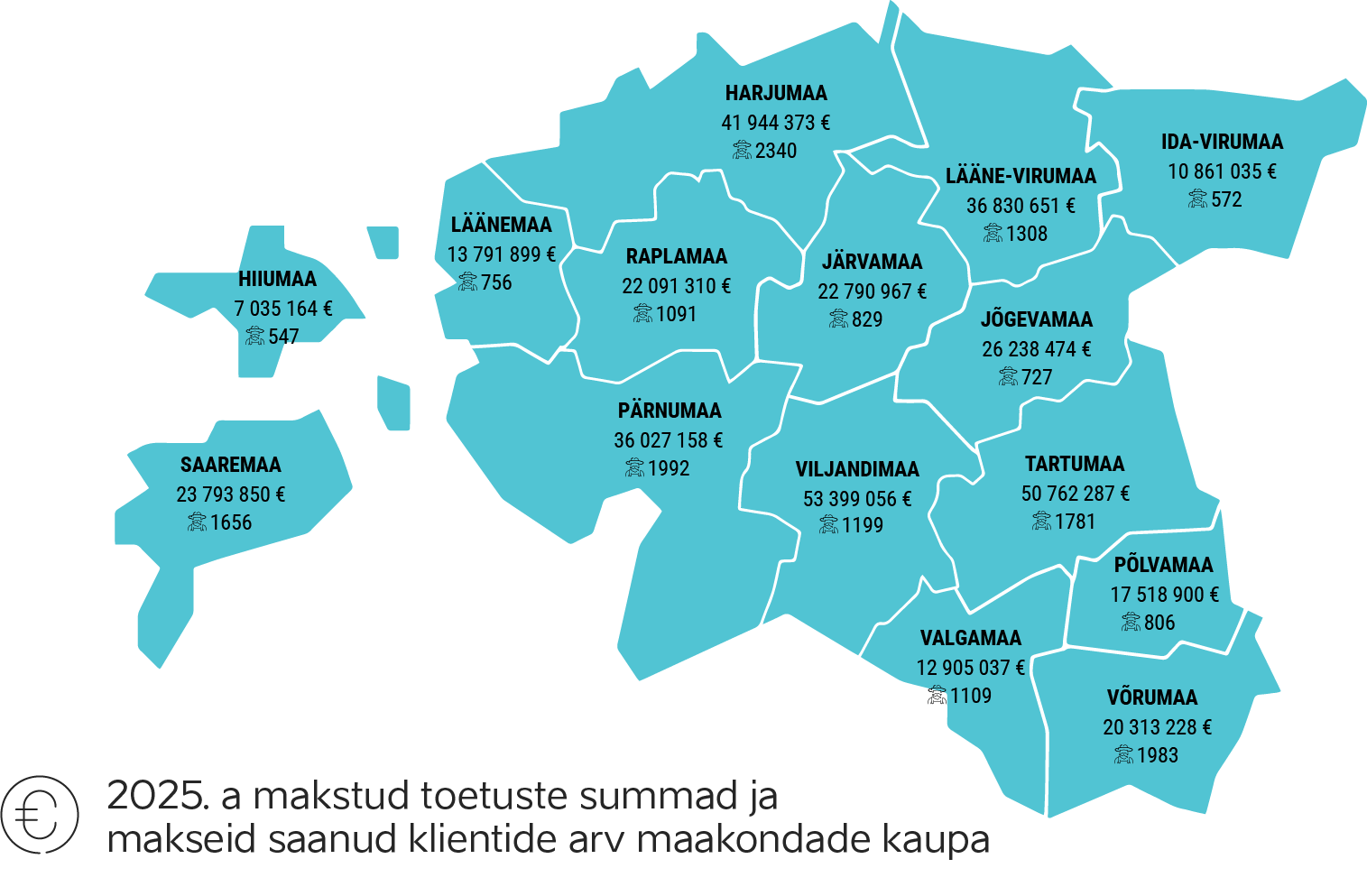 Sarnaselt eelmiste aastatega oli ka 2025. aastal taas kõige enam toetusesaajaid Harjumaal (2340), järgnesid Pärnumaa (1992) ja Võrumaa (1983). Suurim toetussumma kogunes aasta jooksul kokku Viljandimaale, kus maksti 1199 taotlejale välja üle 53,3 miljoni euro. Toetussummade jagunemine ning toetust saanud klientide arvud maakondade lõikes on toodud järgneval joonisel.