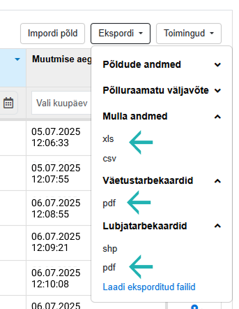 Info eksportimiseks tuleb ära märkida põldude põhitabelis huvipakkuvad põllud, avada „Ekspordi“ vaade ning valida sobiv failiformaat vastavast sektsioonist. Grupiti eksport aitab mullaproovidest ja tarbekaartidest kiiresti tervikliku ülevaate saada.